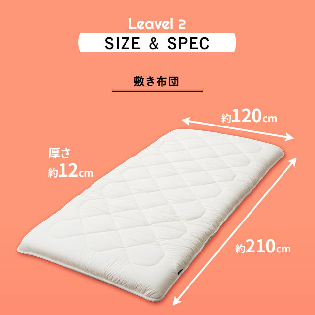 掛け布団:約幅170×奥行210cm ※こちらのサイズは生地幅より大きい幅になるため、生地のつなぎが入ります。ご理解・ご了承ください。 敷き布団:約幅120×奥行210×厚さ12cm |