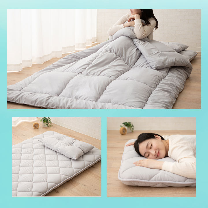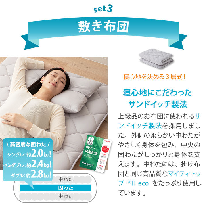 三層式サンドイッチ製法による敷き布団は、柔らかな寝心地としっかりとした支えを両立します。