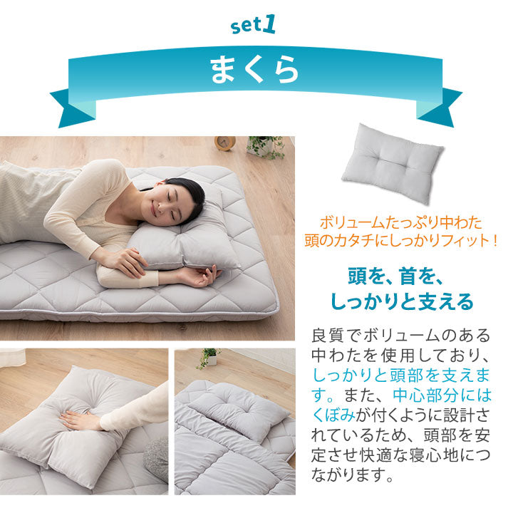 シングル、セミダブル、ダブルの3サイズから選べ、新生活や来客用にも最適な布団セットです。