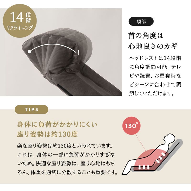 背もたれとヘッドレストの角度を調節でき、自分好みのリラックス姿勢を実現できます。