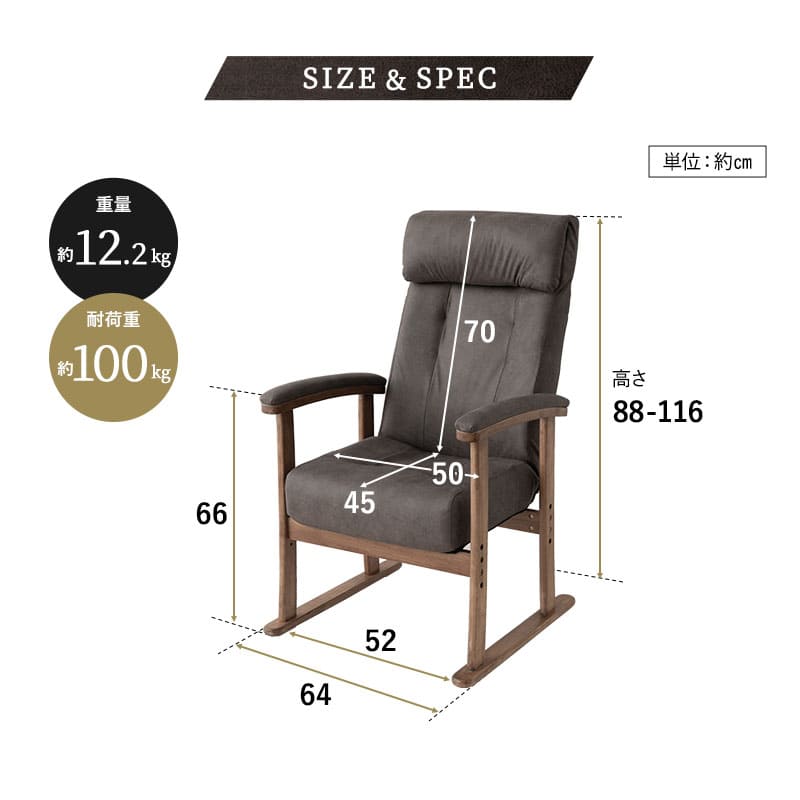| サイズ | 全体:約幅64×奥行62-104×高さ88-116cm 座面:約幅50×奥行45×高さ42-48cm 背もたれ:約幅50×長さ70cm |