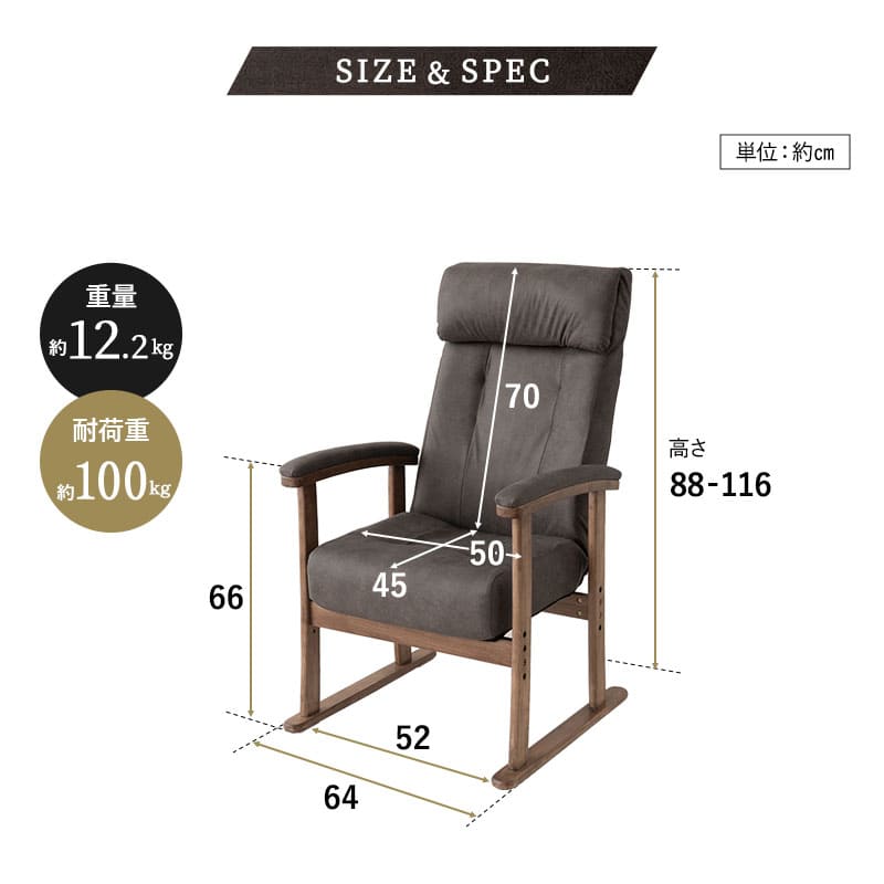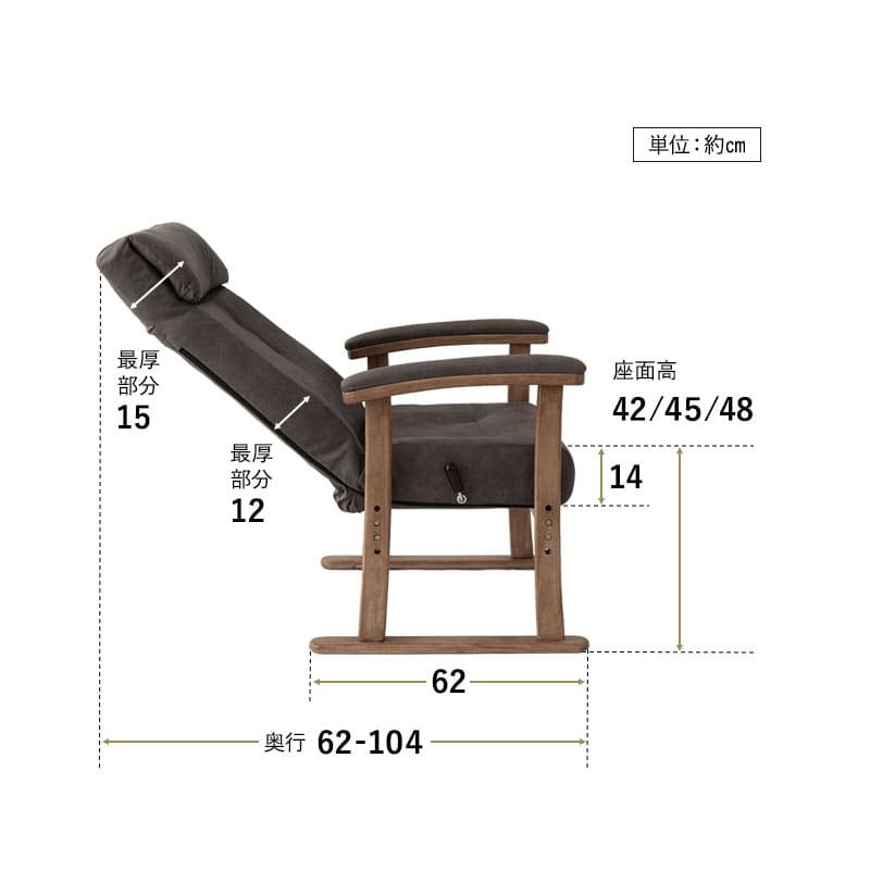 | 高座椅子 | ■サイズ 全体:約幅64×奥行62-104×高さ88-116cm 座面:約幅50×奥行45cm 座面高:42/45/48cm 肘の高さ:約66cm 背もたれ:約幅50×長さ70cm ※計測する位置や角度により、若干の誤差が生じる場合があります。 ■素材 フレーム:スチール 中材:ポケットコイルシート 張地:ポリエステル100%(ファブレザー) 肘:天然木(ポプラ) ■製品重量 約12.2kg ■耐荷重 約100kg ■仕様 座面3段階高さ調節 ヘッドレスト14段階角度調節 背面レバー式無段階リクライニング |