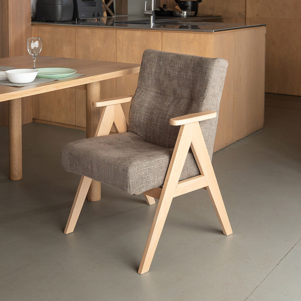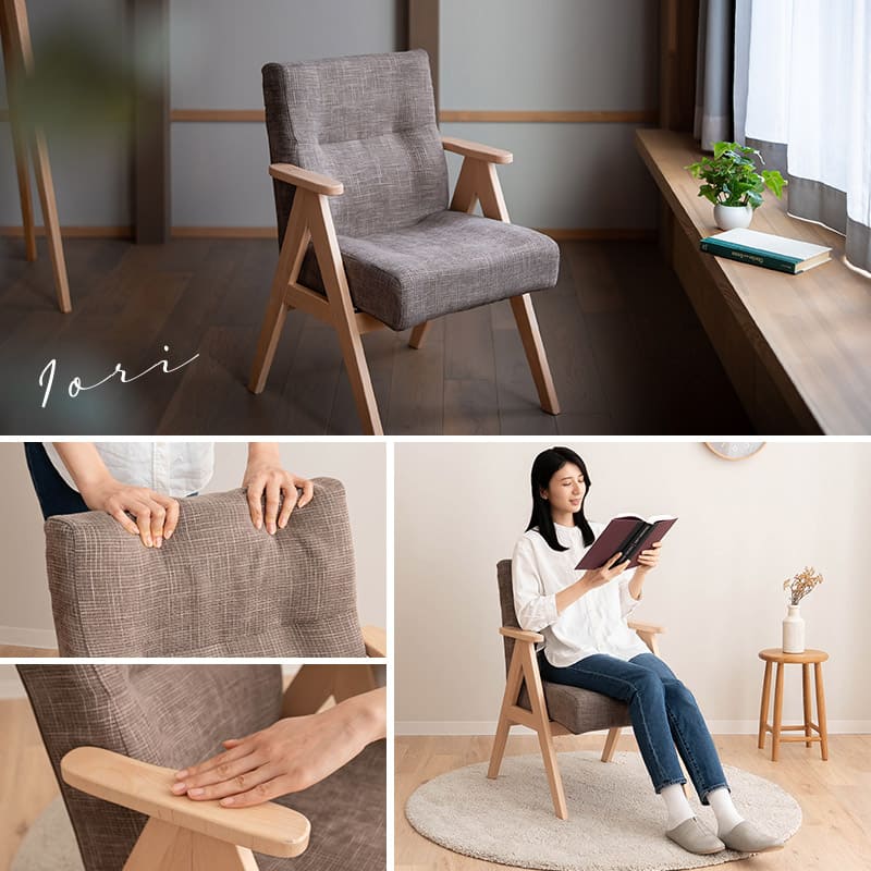 脚、肘部にはビーチ無垢材を使用したナチュラルな質感。シートには落ち着いた風合いの生地を組み合わせ、和洋どちらのインテリアにも馴染むデザインです。
