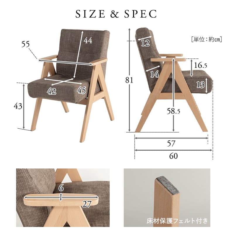 | サイズ | 全体:約幅55×奥行60×高さ81cm 座面:約幅45×奥行42×高さ43cm 肘の高さ:約58.5cm 背もたれ:約幅45×長さ44cm ※計測する位置や角度により、若干の誤差が生じる場合があります。 |