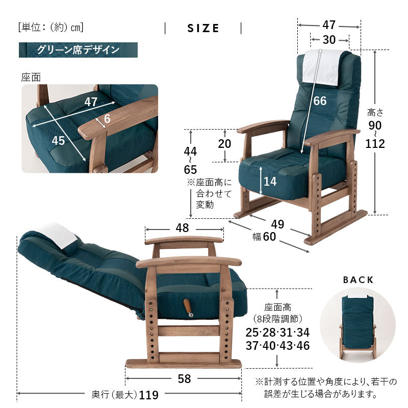 | サイズ | ■普通席デザイン 約幅60×奥行(最大)約95×高さ約94-100cm ■グリーン席デザイン 約幅60×奥行(最大)約119×高さ約90-112cm ※計測する位置や角度により、若干の誤差が生じる場合があります。 |
