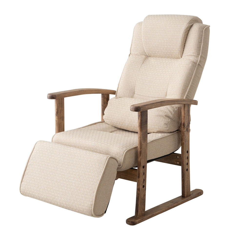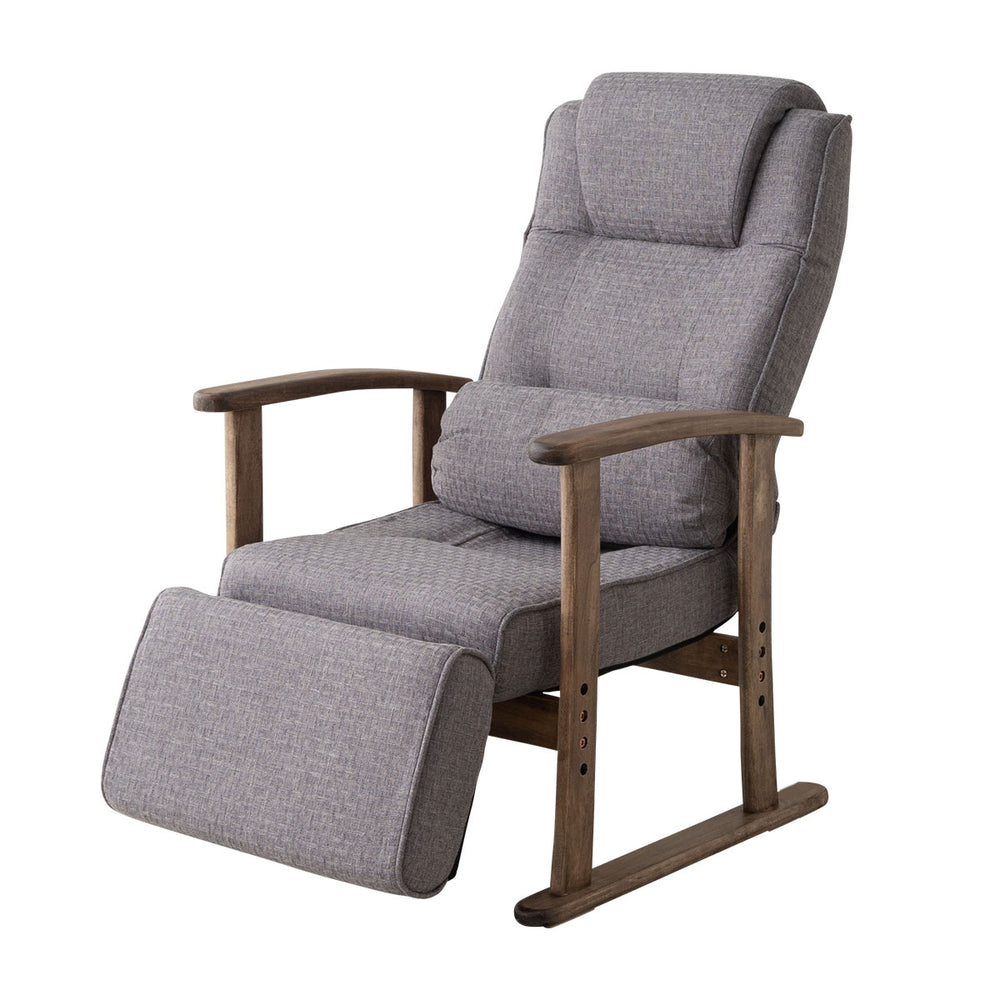 仕様 | 座面:高さ調節(3段階) 頭部:ヘッドレストリクライニング(14段階) 背面:レバー式リクライニング(無段階) 腰部:専用クッション付き 脚部:オットマン長さ調節&リクライニング(14段階) |