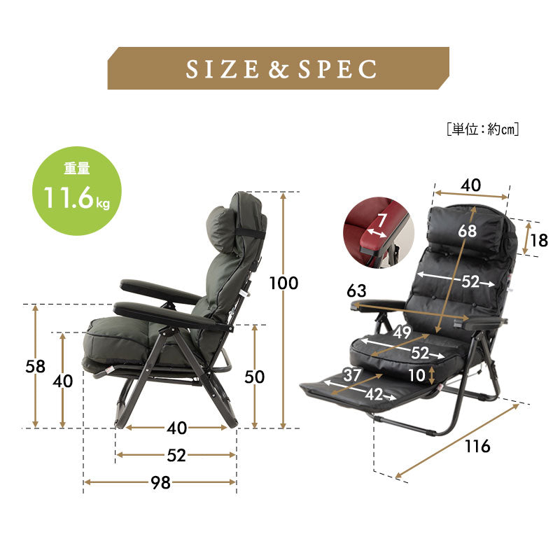 仕様 | 折りたたみ式 ヘッドレスト角度調節(14段階) 背面リクライニング(6段階) スライド式オットマン付き ベルト式クッション付き |