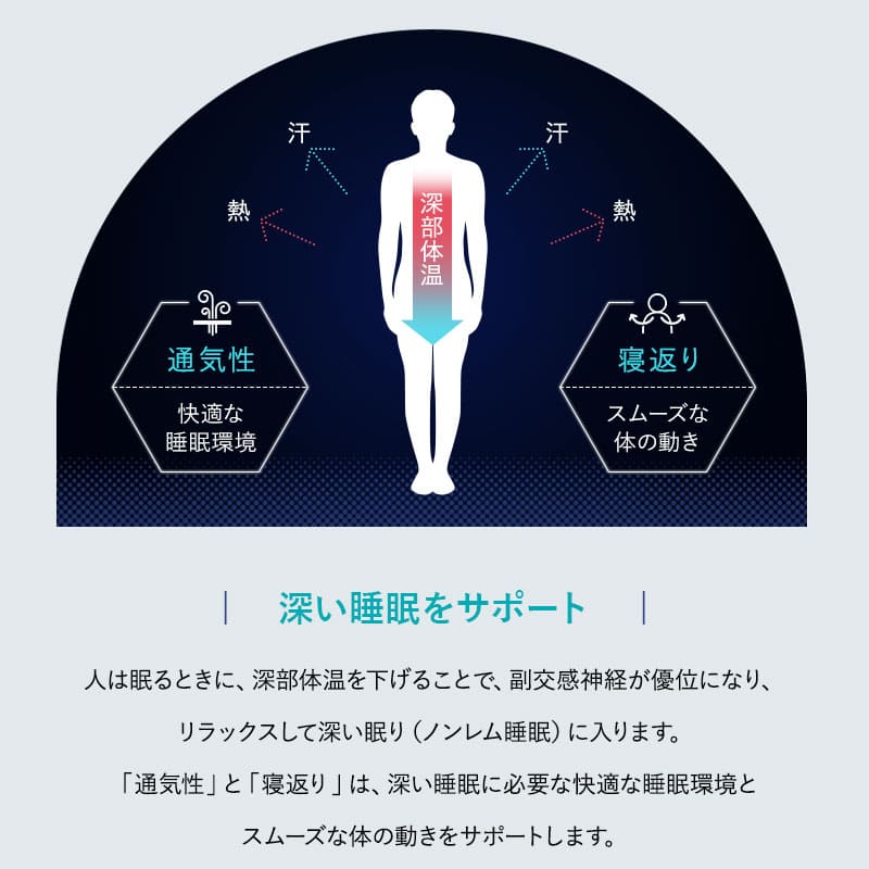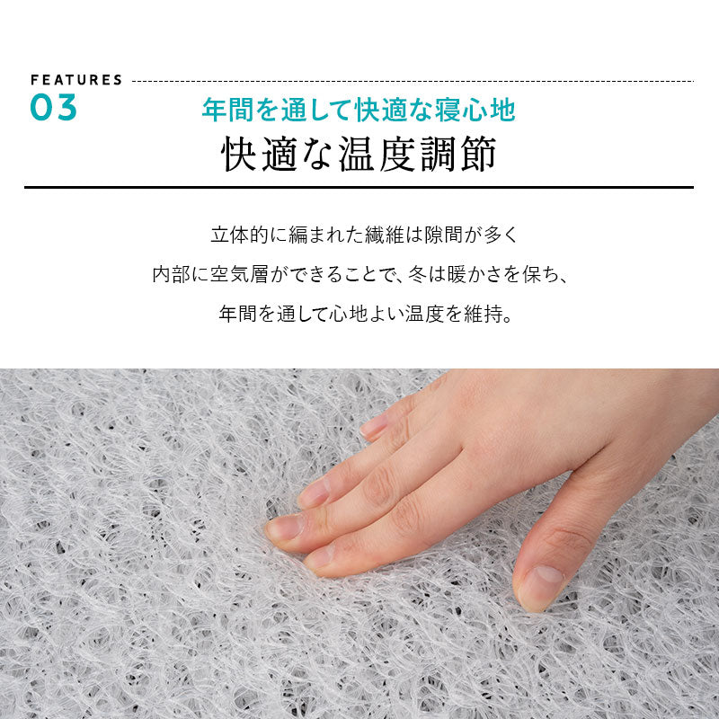 通気性抜群で熱がこもりにくく、蒸れや寝汗を軽減し、年間を通して快適な寝心地を提供します。