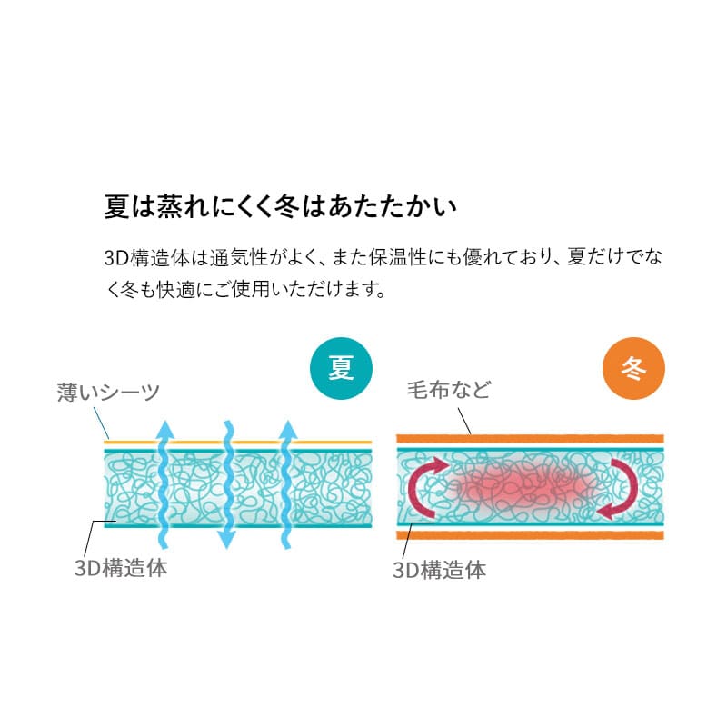 特殊な3D構造体により高反発で体を支え、寝返りやすさと理想的な寝姿勢を実現するマットレスです。