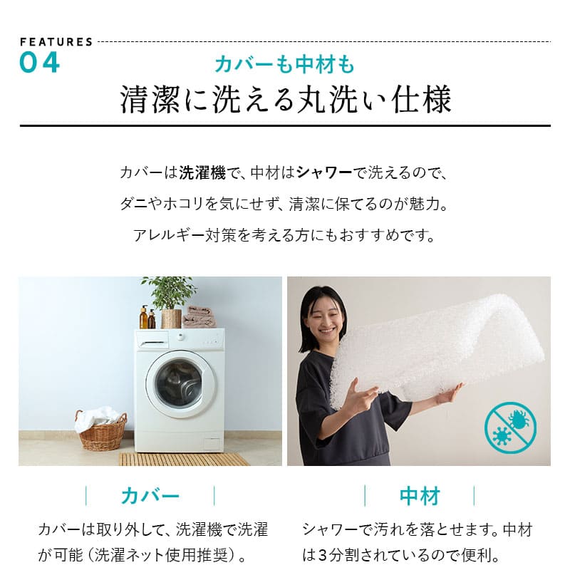 カバーは洗濯機で、中材は丸洗い可能で清潔に保て、アレルギー対策や来客用にもおすすめです。