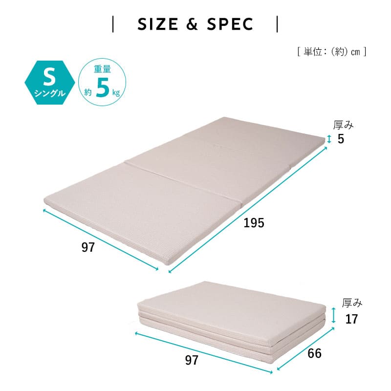 サイズ | シングルサイズ:約幅97×奥行195×厚さ5cm (折りたたみ時:約幅97×奥行66×厚さ17cm) |