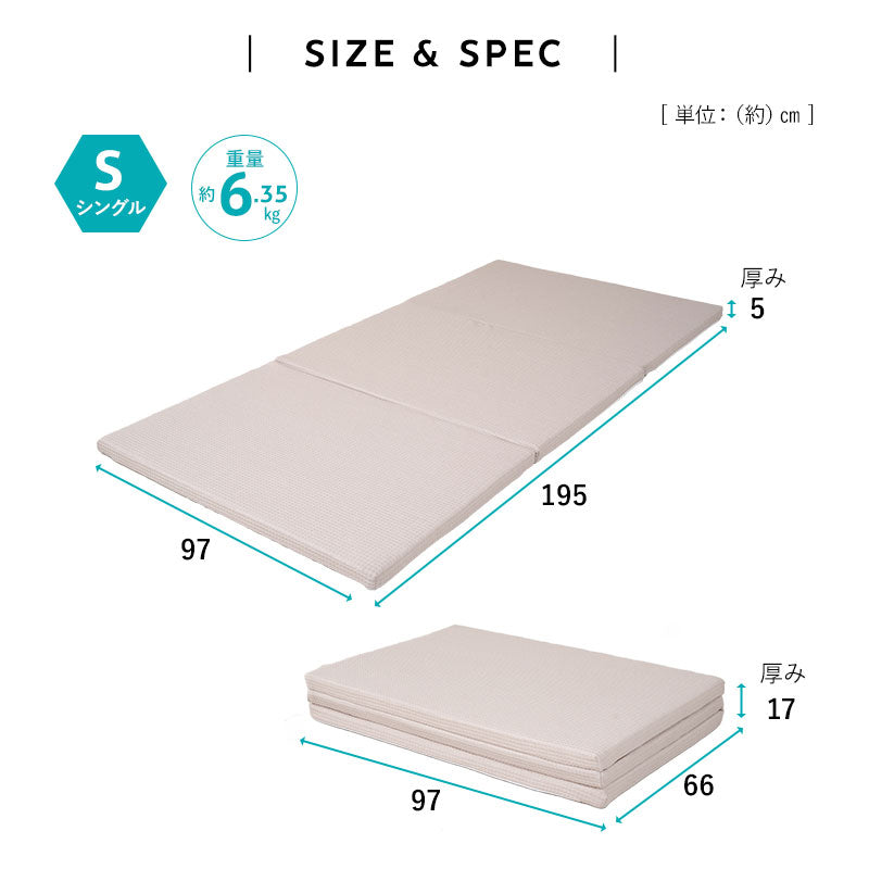 | サイズ | シングルサイズ:約幅97×奥行195×厚さ5cm (折りたたみ時:約幅97×奥行66×厚さ17cm) |