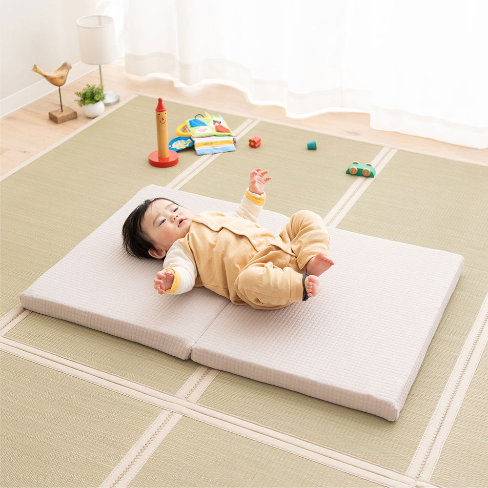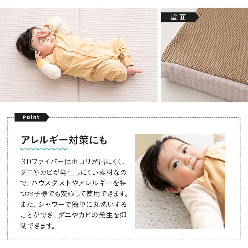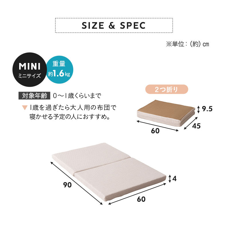 サイズ | ミニサイズ:約幅60×奥行90×厚さ4cm (折りたたみ時:約幅60×奥行45×厚さ9.5cm) ※対象年齢:0~1歳くらいまで ベビーサイズ:約幅70×奥行120×厚さ4cm (折りたたみ時:約幅70×奥行60×厚さ9.5cm) ※対象年齢:0~3歳くらいまで |