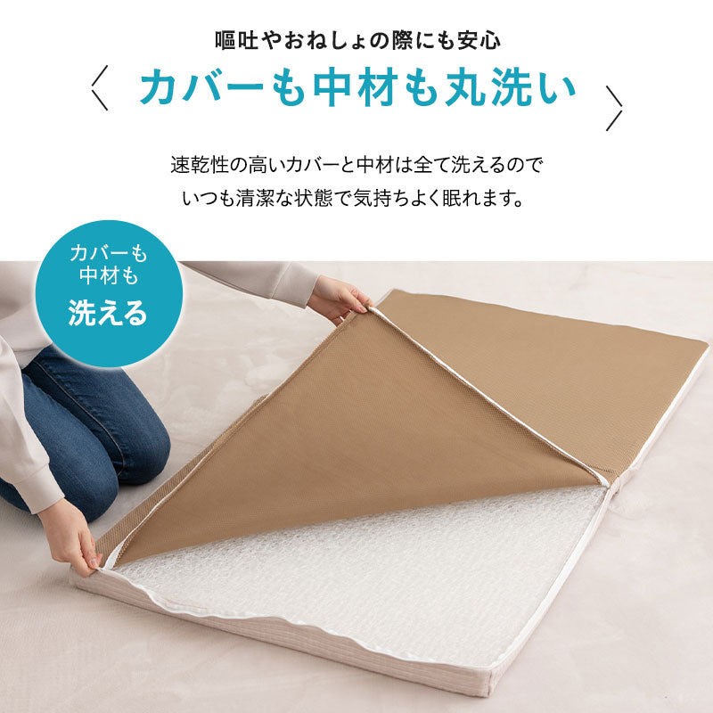 カバーも中材も丸洗いでき、速乾性が高く常に衛生的な状態を保てます。
