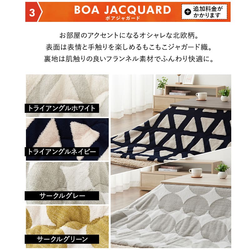 こたつ掛け布団 | ■サイズ 全体:約幅230×奥行190cm ■組成 <ジャガードカチオン> 表生地:ポリエステル100%(ジャガード) 中綿:ポリエステル100% 裏生地:ポリエステル100%(フリース) お手入れ方法:手洗い可能 <ヒートプラス> 表生地:ポリエステル100%(280g/m² ロングパイルフランネル8mm) 中綿:ポリエステル100% 裏生地:ポリエステル100%(フリース) お手入れ方法:手洗い可能 <北欧柄> 表生地:ポリエステル100%(ボアジャガード) 中綿:ポリエステル100% 裏生地:ポリエステル100%(フランネル) お手入れ方法:洗濯機洗い可能(洗濯ネット使用推奨) ■カラー <ジャガードカチオン> モカブラウン/ライトグレー <ヒートプラス> ブラウン/グレージュ/アイボリー <北欧柄> トライアングルホワイト/トライアングルネイビー サークルグレー/サークルグリーン ■製造国 中国 |