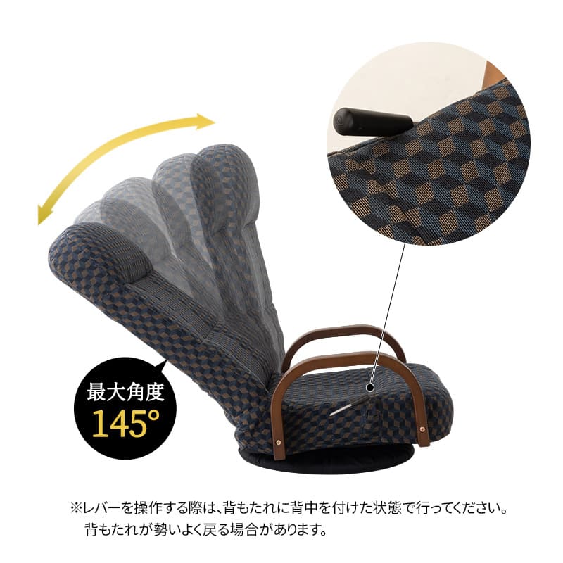 手元レバーで背もたれをリクライニング可能。座ったまま好みに合わせて角度調整ができ、快適な姿勢を保てます。