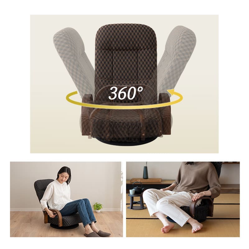 360°回転機能により、立ち上がりや向き変更も簡単。物を取る時も座ったまま方向転換できてストレスフリーです。
