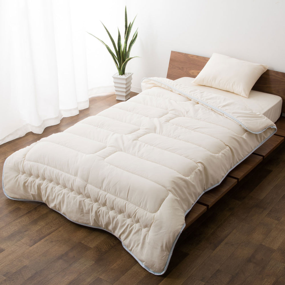 サイズ | 【シングル】 約150×210cm わた量0.6kg 総重量:約1.5kg 【セミダブル】 約170×210cm わた量0.7kg 総重量:約1.8kg 【ダブル】 約190×210cm わた量0.8kg 総重量:約2.0kg 【クイーン】 約210×210cm わた量1.0kg 総重量:約2.4kg |