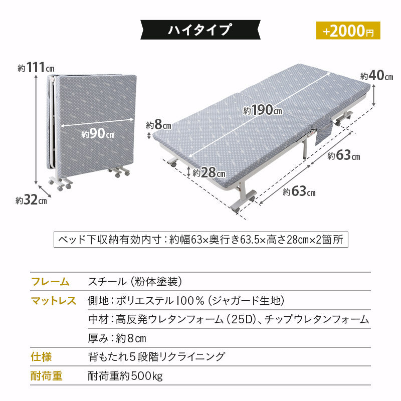 サイズ | シングルサイズ ノーマルタイプ:約幅90×奥行190×高さ28cm (折りたたみ時:約幅90×奥行32×高さ104cm) ハイタイプ:約幅90×奥行190×高さ40cm (折りたたみ時:約幅90×奥行32×高さ111cm) マットレスの厚さ:約8cm |