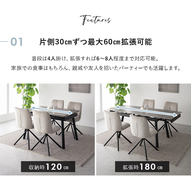 片側30cmずつ最大60cmの伸長機能で、4人から8人まで柔軟に対応できる優れた拡張性を備えています。