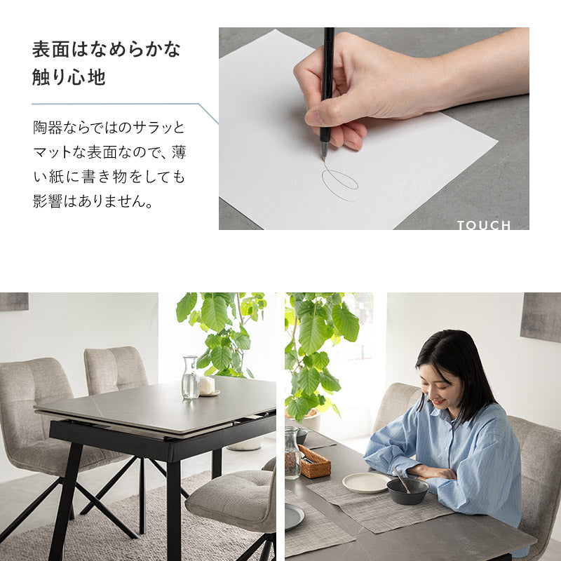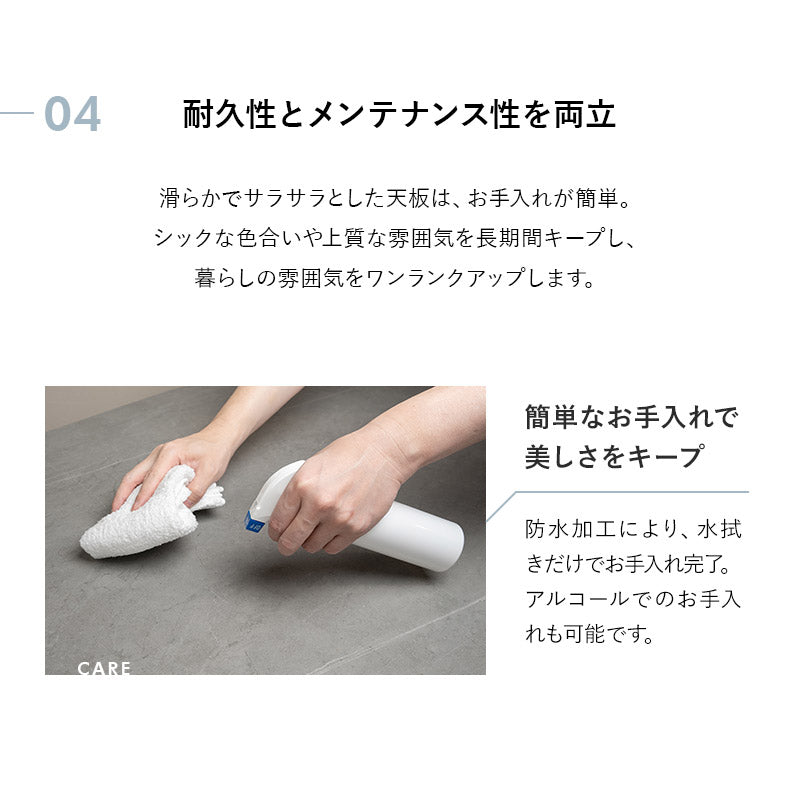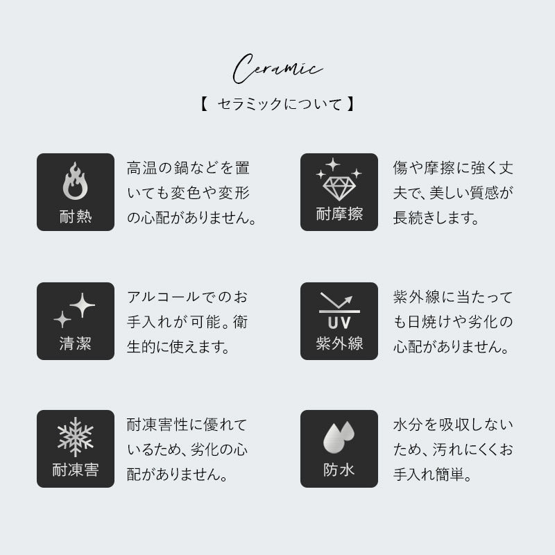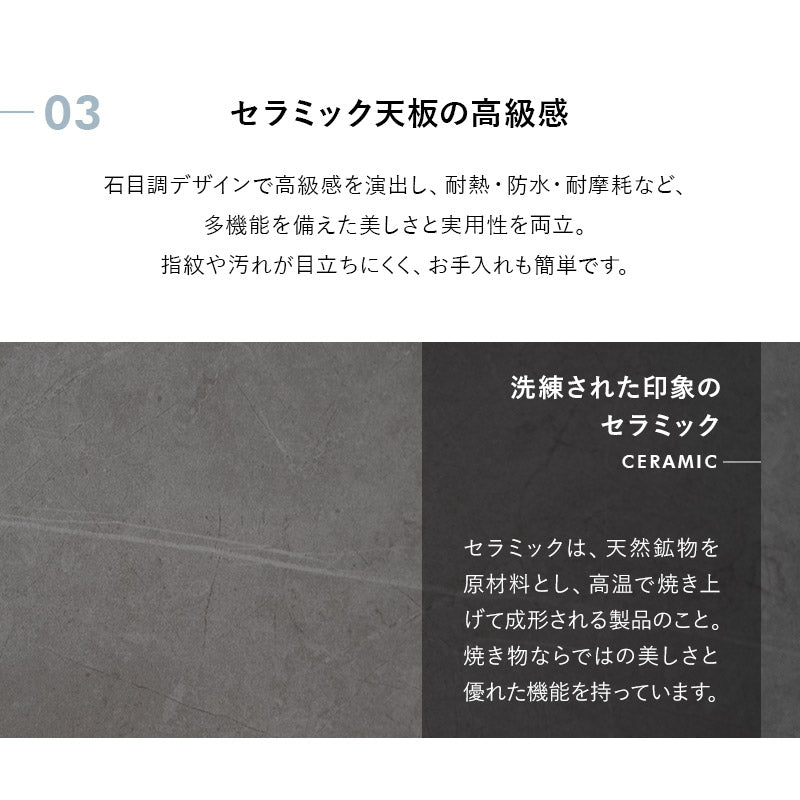 耐熱・防水・耐摩耗に優れたセラミック天板は高級感があり、指紋や汚れが目立ちにくくお手入れも簡単です。