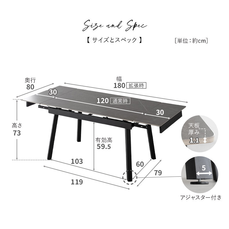 サイズ | 約幅120-180×奥行80×高さ73cm |