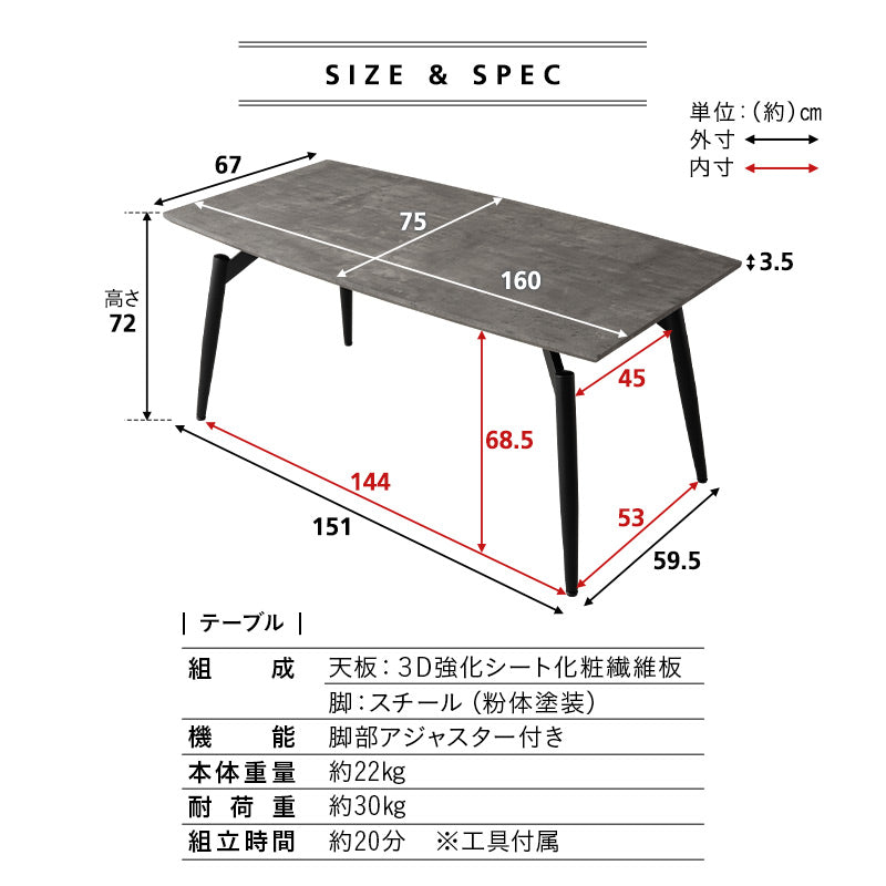 材質 | 天板:3D強化シート化粧繊維板 脚:スチール(粉体塗装) |