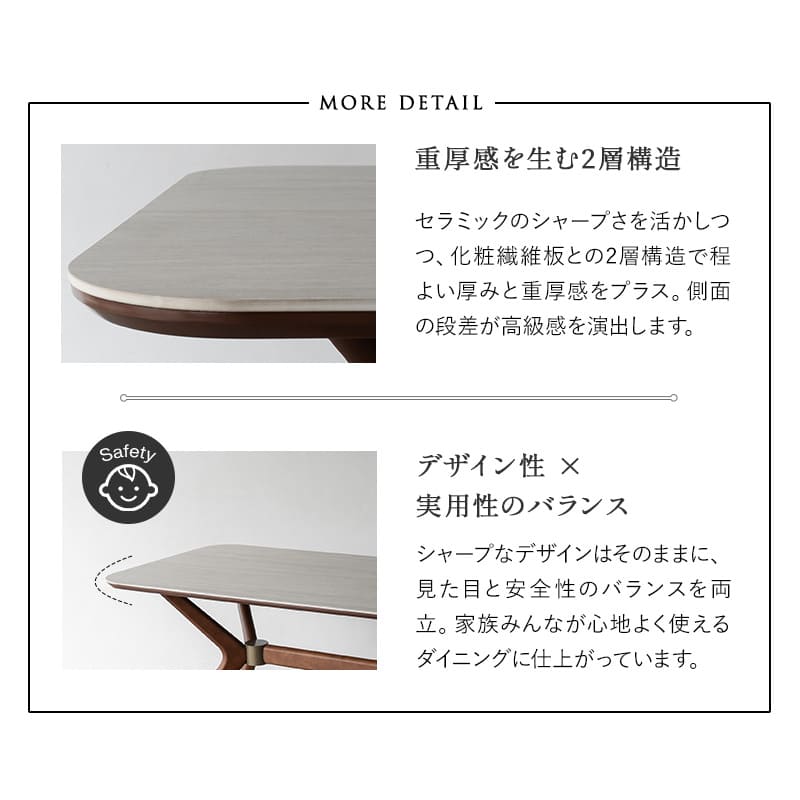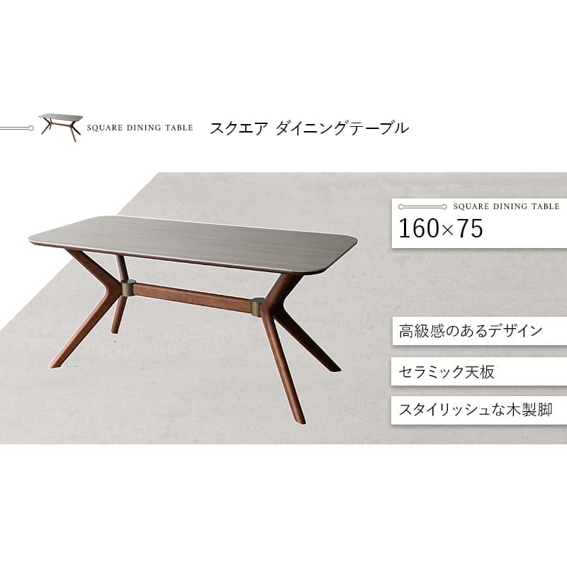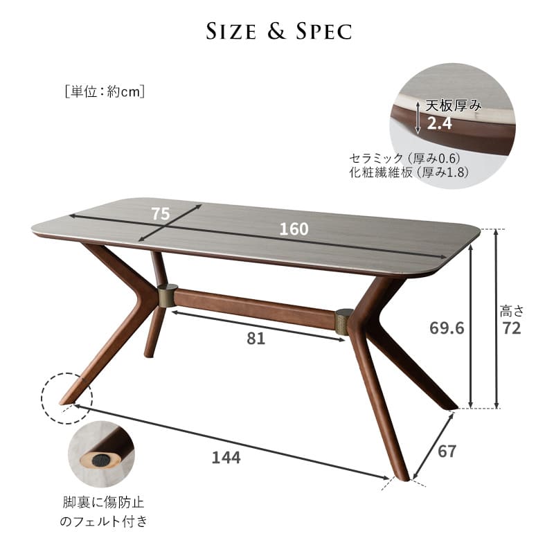 | ダイニングテーブル | 約幅160×奥行67×高さ72cm 天板:セラミック(厚み6mm)化粧繊維板(厚み18mm) 脚:天然木(ラバーウッド) 脚部結合金具:金属製 重量:約47.4kg 耐荷重:約50kg |