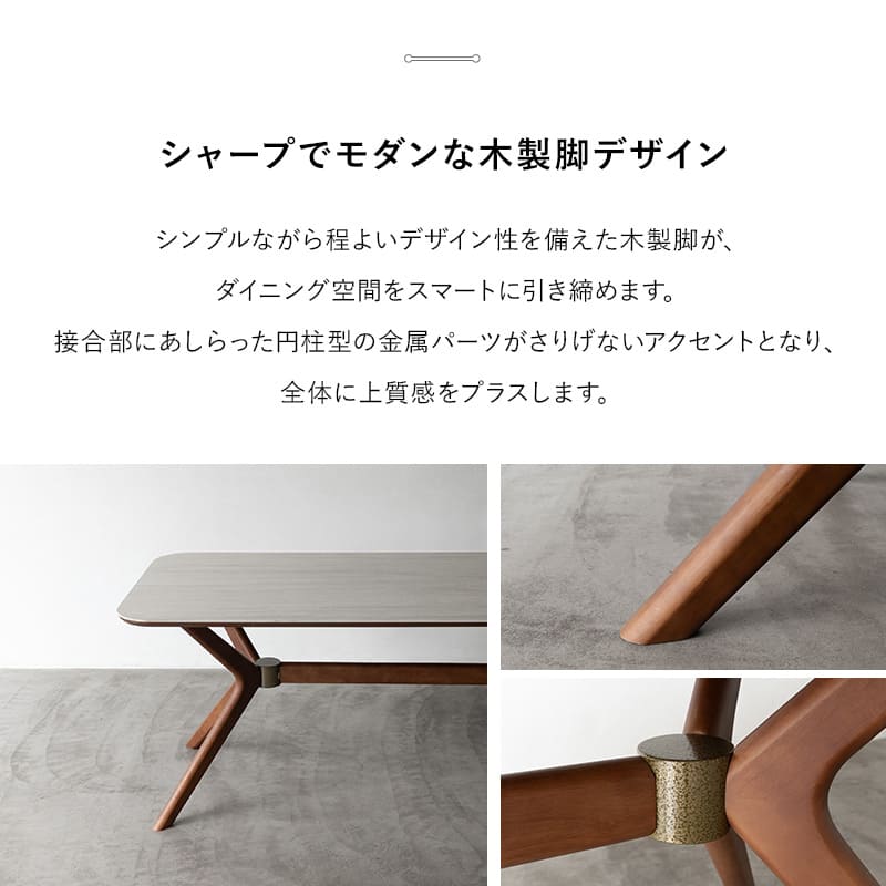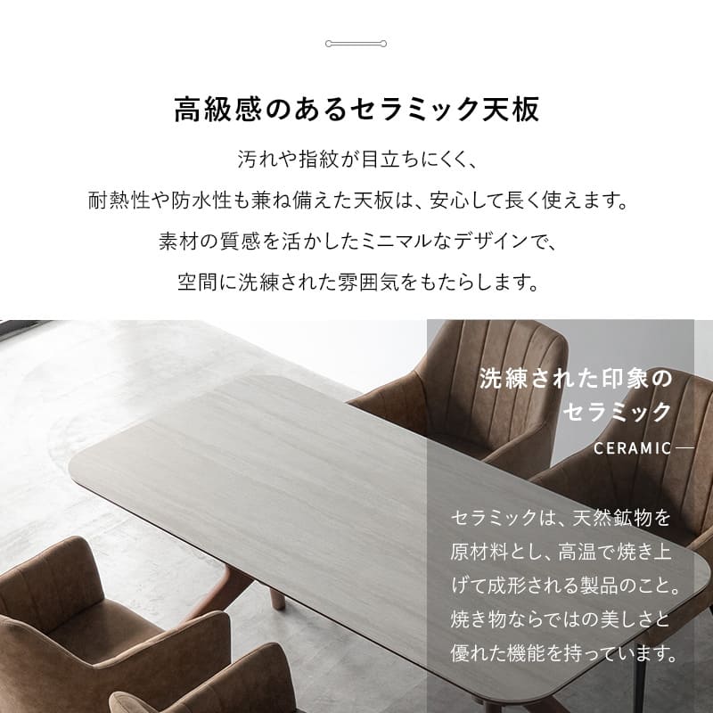石目調セラミックの天板と、デザイン性のある木製脚で上質感をプラス。ダイニング空間をスマートに引き締めます。