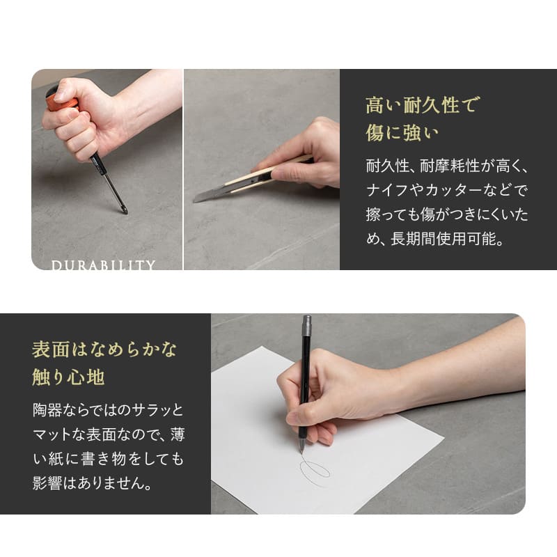 なめらかでサラサラとした天板は耐久性とメンテナンス性もバッチリ。シャープなデザインはそのままに、見た目と安全性のバランスを両立させました。