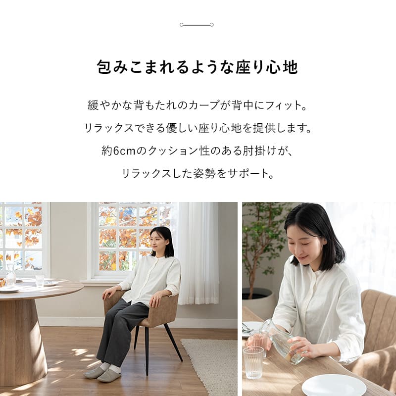 セットのチェアは、包み込む背もたれや厚みのある肘掛けにより、長時間でも快適な座り心地を実現しています。