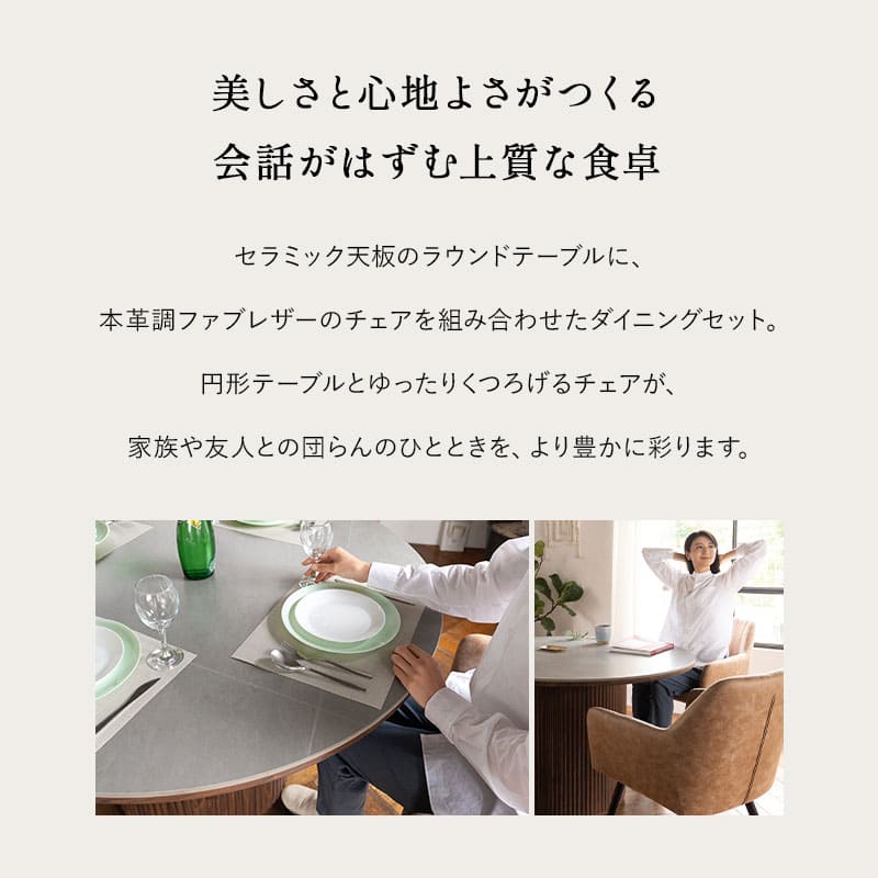 円形の石目調セラミック天板テーブルと本革調ファブレザーチェアを組み合わせた、高級感あふれる5点セットです。