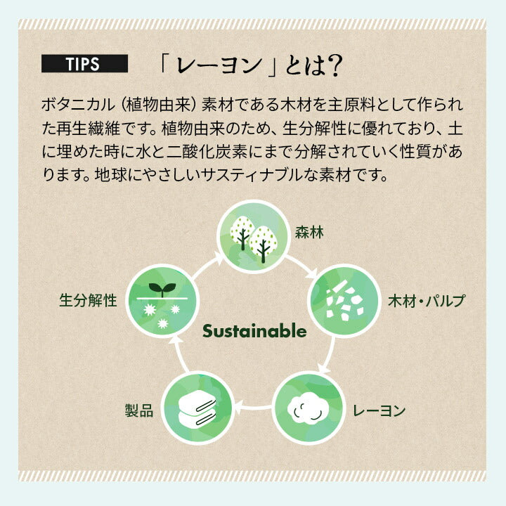 レーヨン生地は柔らかくシルクのような肌触りで、吸湿性と高い消臭効果を実現しています。