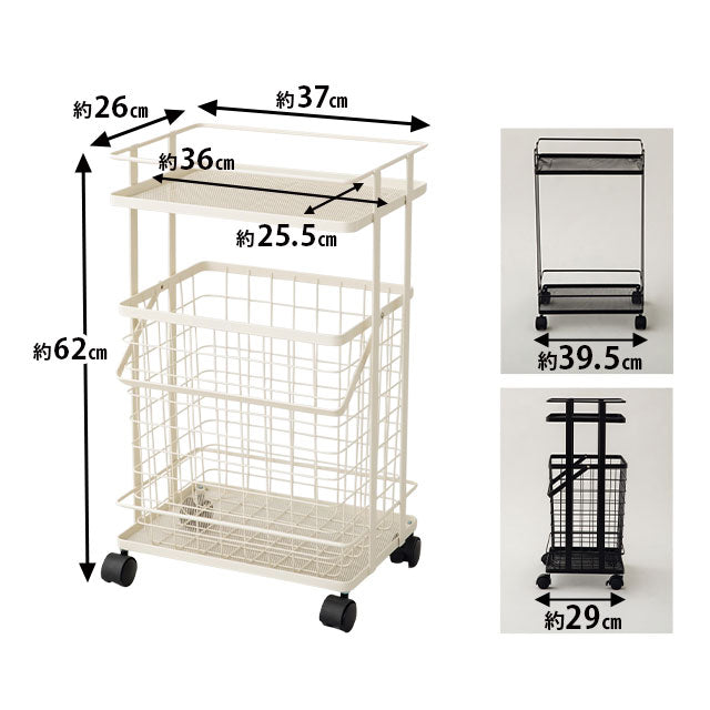 サイズ | 全体(キャスター含む):約幅39.5×奥行29×高さ62cm 棚:約幅36×奥行25.5cm バスケット:約幅31.5×奥行25×高さ36cm (約1.1kg) |
