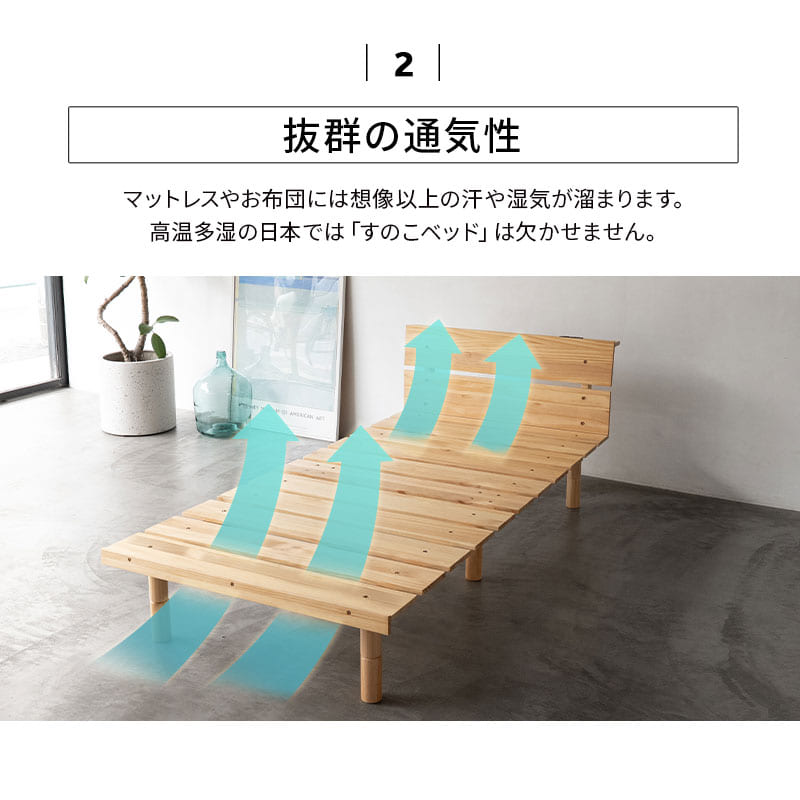 抜群の通気性ですのこ構造が湿気やカビを防ぎ、マットレスや布団も長持ち。快適な睡眠環境をキープします。