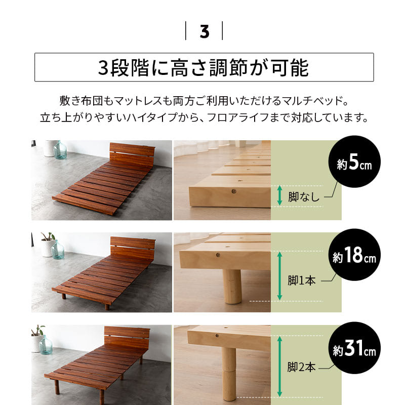 約5cm、18cm、31cmの三段階で高さ調節が可能で、敷き布団もマットレスも使える万能設計。立ち上がりしやすいハイベッド、部屋が広く感じるローベッドなど、幅広い年代におすすめです。