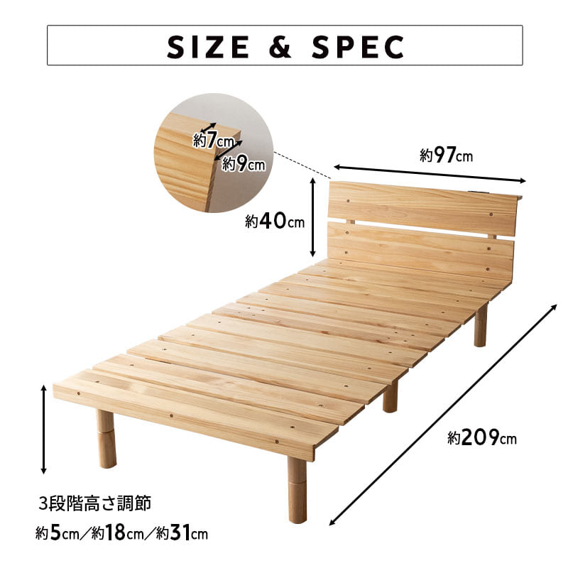 | サイズ | シングルサイズ:約幅97×奥行209cm 高さ:約5/18/31cm(3段階調節) |