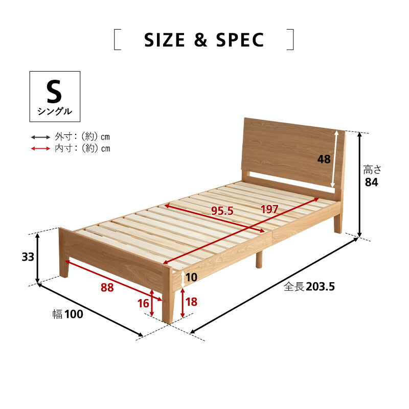 サイズ | シングルサイズ 全体(ヘッドボード含む):約幅100×奥行203.5×高さ85cm 床面:約幅95.5×奥行197×高さ28cm |