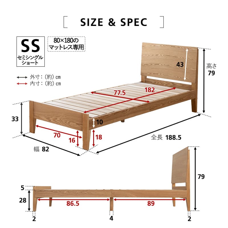| サイズ | <セミシングルショートサイズ> 全体(ヘッドボード含む):約幅82×奥行188.5×高さ79cm 床面:約幅77.5×奥行182×高さ28cm <シングルサイズ> 全体(ヘッドボード含む):約幅100×奥行203.5×高さ85cm 床面:約幅95.5×奥行197×高さ28cm |