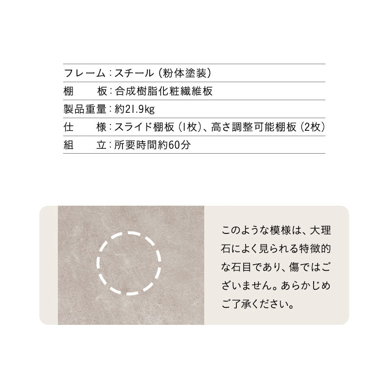 組成 | フレーム:スチール(粉体塗装) 棚板:合成樹脂化粧繊維板 |