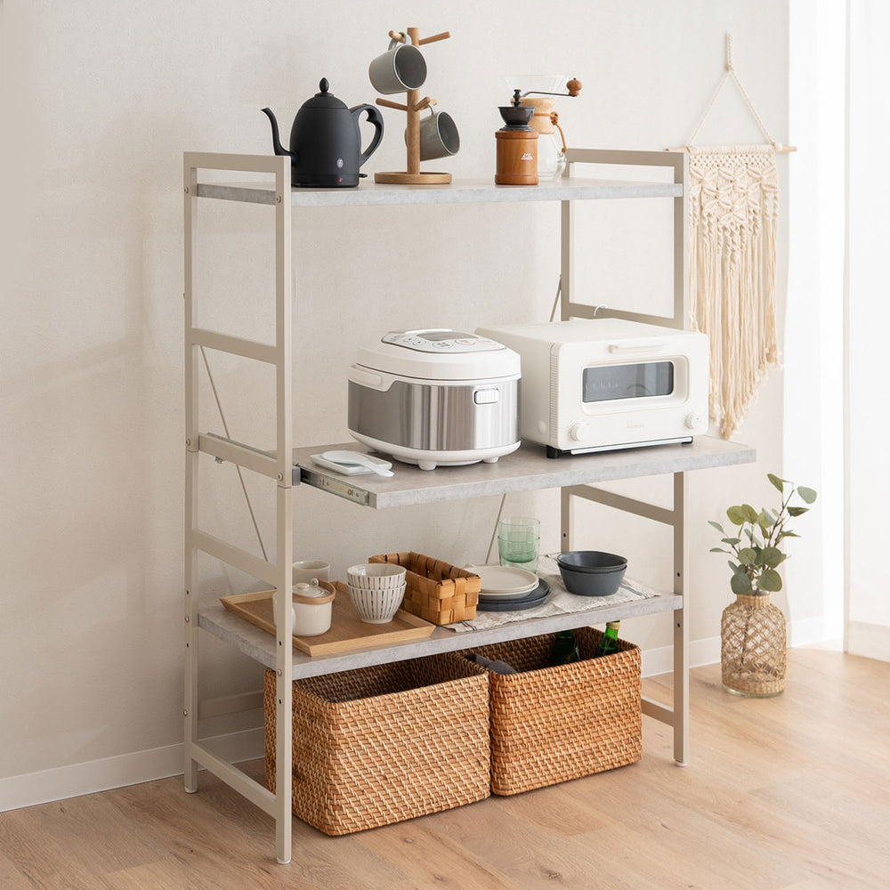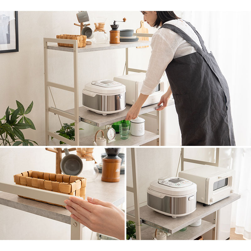 2段引きスライドレール採用で、炊飯器やポットなど蓋つき家電も手前に出しやすく、使い勝手を向上させています。