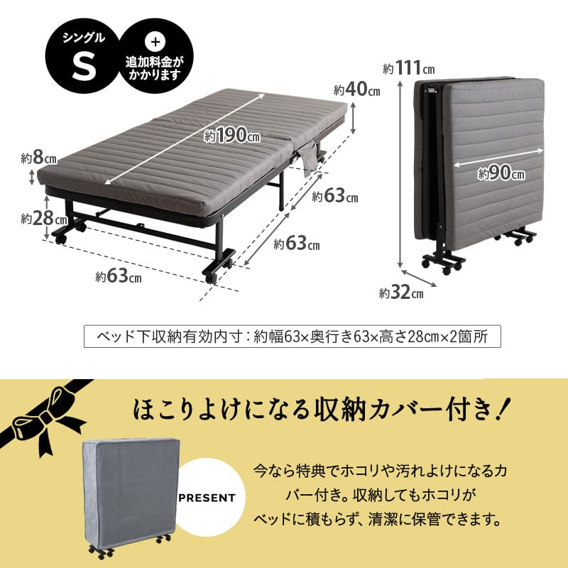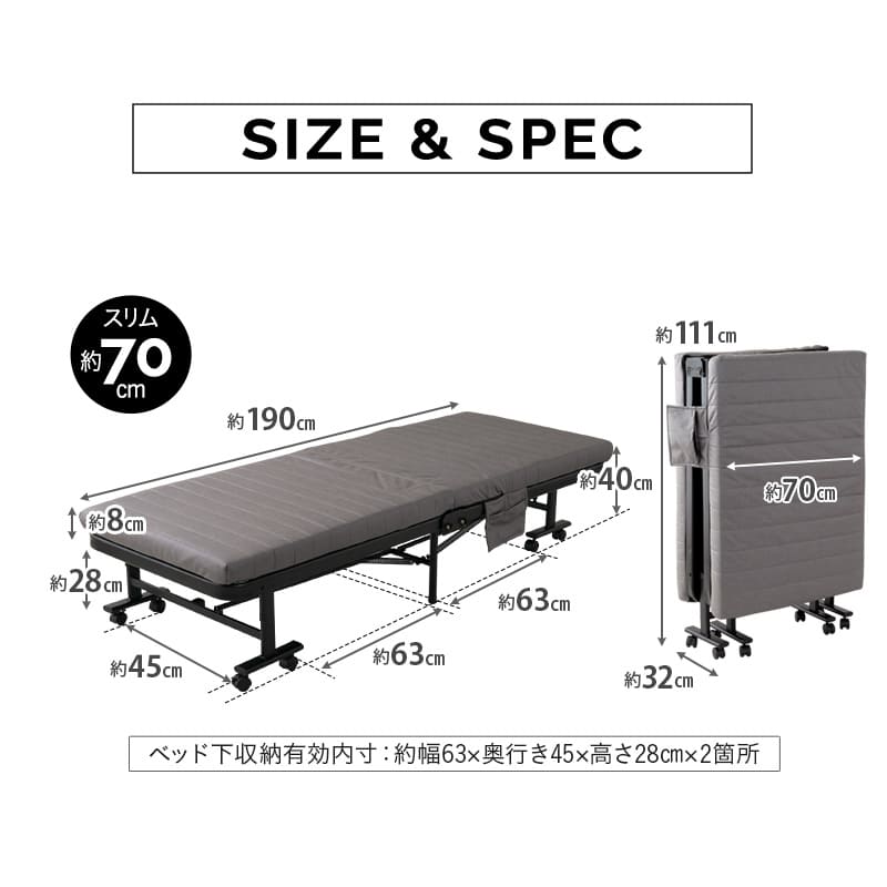 <シングルサイズ> ハイタイプ:約幅90×奥行190×高さ40cm (折りたたみ時:約幅90×奥行32×高さ111cm) マットレスの厚さ:約8cm <スリムサイズ> ハイタイプ:約幅70×奥行190×高さ40cm (折りたたみ時:約幅70×奥行32×高さ111cm) マットレスの厚さ:約8cm |