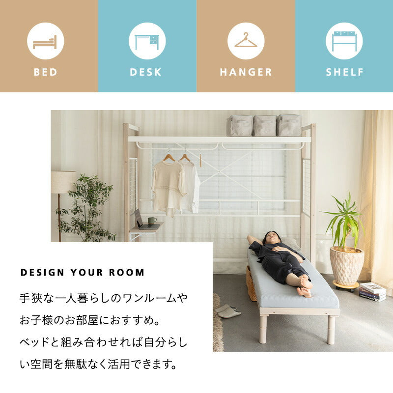 ベッドと組み合わせられるデスク付きハンガーシェルフ