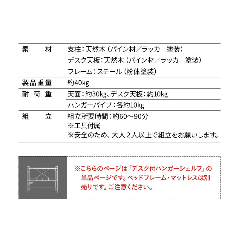 サイズ | 全体:約幅220×奥行60×高さ196cm デスク:約幅60×奥行32×高さ69cm ハンガーパイプ(1本あたり):約幅101cm ※ベッドフレーム・マットレスは別売りです。 |