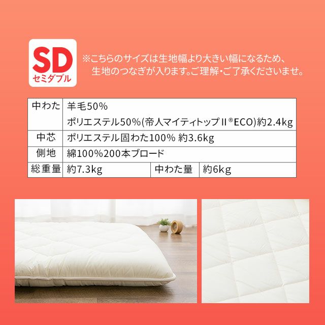 ■掛け布団 中わた:羊毛50%・ポリエステル50%(帝人マイティトップ2(R)ECO)約2.1kg 側地:綿100%200本ブロード 総重量:約3.1kg 中わた量:約2.1kg ※6ヶ所ループ付き ■敷き布団 中わた:羊毛50%・ポリエステル50%(帝人マイティトップ2(R)ECO)約2.4kg 中芯:ポリエステル固わた100% 約3.6kg 側地:綿100%200本ブロード 総重量:7.3kg 中わた量:約6kg |
